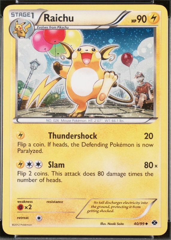 The Raichu 2012 Black & White: Next Destinies #40/99 Promo (Cosmos Holo) card in Raw TCG (Moderately Played) condition has not changed in price in the last 30 days and was last sold for $30.00 .