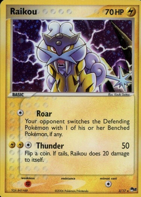 The Raikou 2005 POP Series 2 #03/17 Holo card in Raw TCG (Near Mint) condition has moved up $15.00 (+75.0%) in the last 30 days and was last sold for $34.99 .