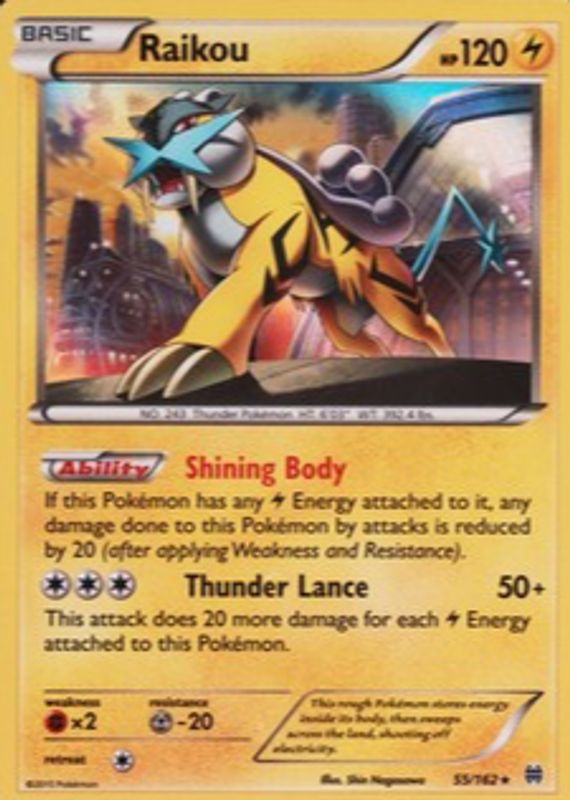 The Raikou 2015 XY: BREAKthrough #055/162 Holo card in Raw TCG (Near Mint) condition has moved down -$2.54 (-46.0%) in the last 30 days and was last sold for $2.98 .