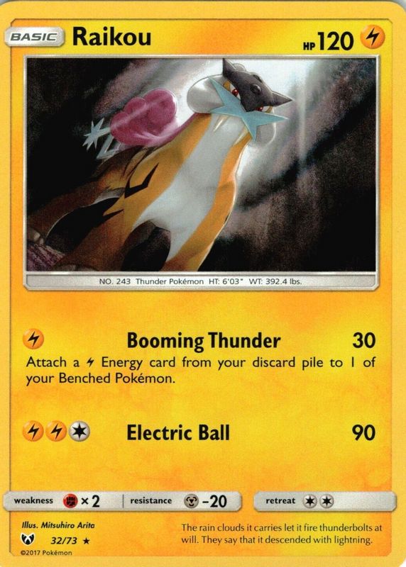 The Raikou 2017 Sun & Moon: Shining Legends #32/73 Holo card in Raw TCG (Near Mint) condition has moved up $0.31 (+14.2%) in the last 30 days and was last sold for $2.50 .
