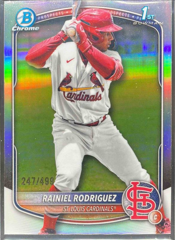 This card is 1 of 88 Rainiel Rodriguez's card variations in the 2025 Bowman Chrome set being tracked by Sports Card Investor, including International Refractor Variation, Prospect Auto (1st), Prospect Auto - Black & White Shimmer Refractor (1st), Prospects (1st), and Prospects - Mini-Diamond Refractor (1st).