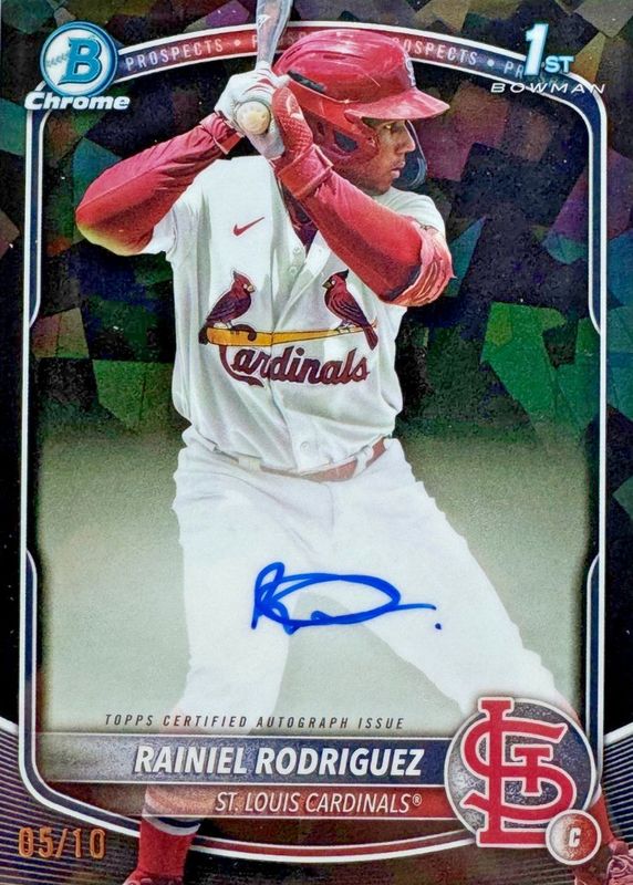 This card is 1 of 18 Rainiel Rodriguez's card variations in the 2025 Bowman Chrome Sapphire Edition set being tracked by Sports Card Investor, including Prospects (1st), Prospects - Yellow /75 (1st), Prospects - Gold /50 (1st), Prospects - Orange /25 (1st), and Prospects - Black /10 (1st).