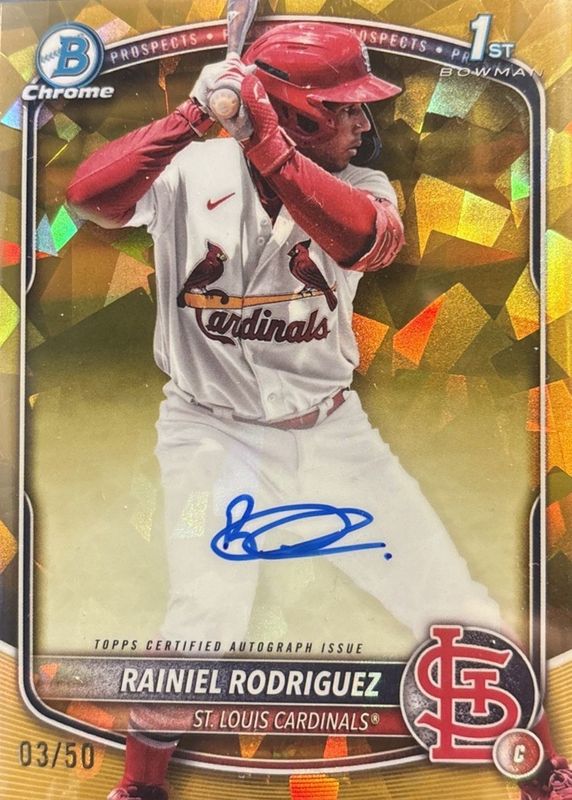 The Rainiel Rodriguez 2025 Bowman Chrome Sapphire Edition #CPSA-RR Prospect Auto - Gold /50 (1st) card in Raw condition has moved up $24.00 (+6.6%) in the last 30 days and was last sold for $385.00 .
