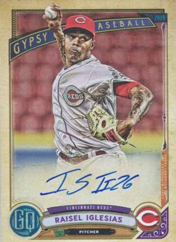The Raisel Iglesias 2019 Topps Gypsy Queen #GQA-RI Autographs card is 1 of 20 Raisel Iglesias' card variations in the 2019 Topps Gypsy Queen set being tracked by Sports Card Investor, including Base, Bazooka Back, GQ Logo Swap, Green, and Missing Nameplate.