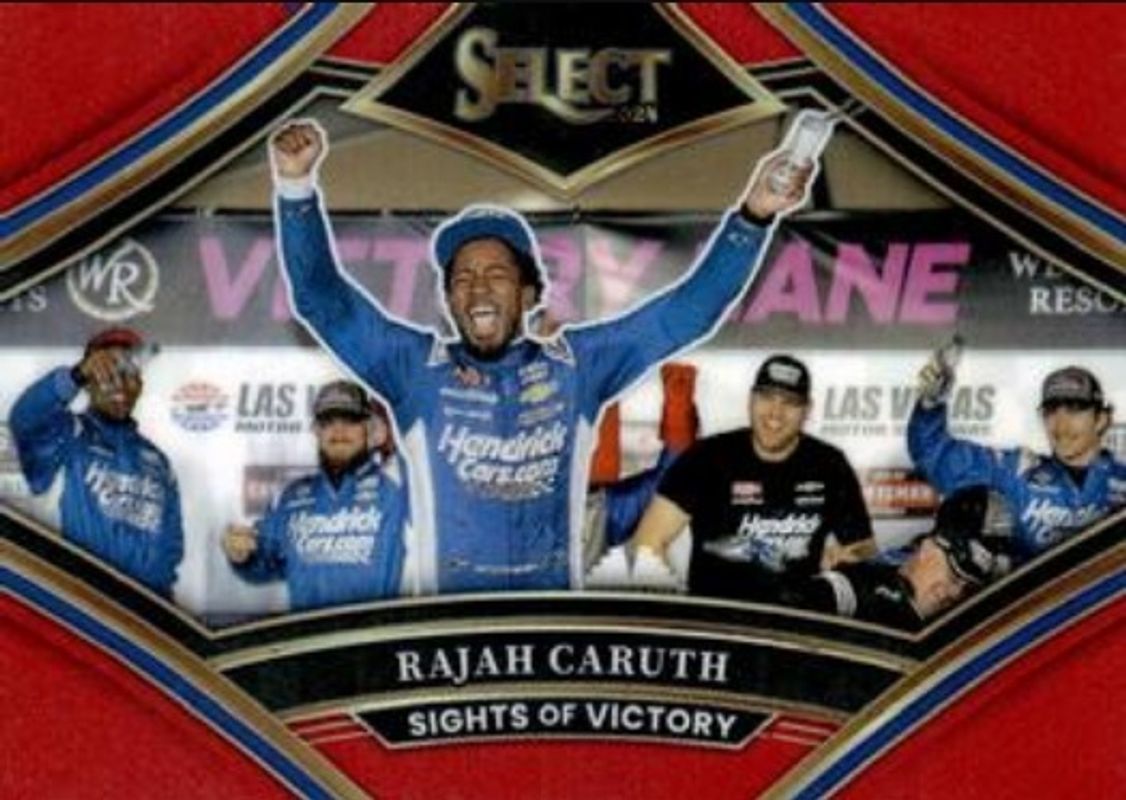 The Rajah Caruth 2024 Select NASCAR #4 Sights Of Victory Red /99 card is 1 of 62 Rajah Caruth's card variations in the 2024 Select NASCAR set being tracked by Sports Card Investor, including #225 Base, #25 Base, #125 Base, #25 Base Orange Flash, and #125 Base Orange Flash.