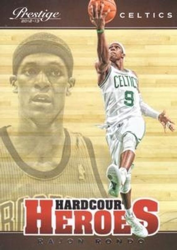 The Rajon Rondo 2012 Prestige #1 Hardcourt Heroes card is 1 of 10 Rajon Rondo's card variations in the 2012 Prestige set being tracked by Sports Card Investor, including Base, Bonus Shots Gold /249, Bonus Shots Black /10, All Stars East, and Inside the Numbers - Materials.