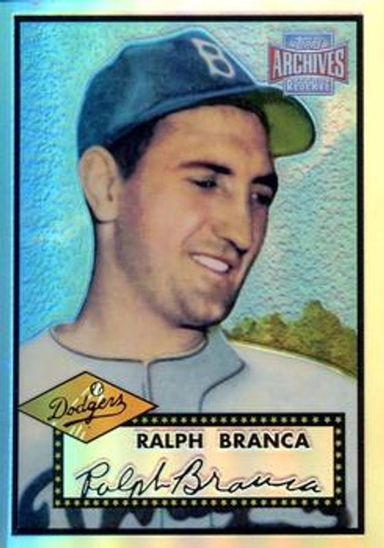 The Ralph Branca 2001 Topps Archives Reserve #43 Base card is 1 of 2 Ralph Branca's card variations in the 2001 Topps Archives Reserve set being tracked by Sports Card Investor, including Autographed Baseballs.