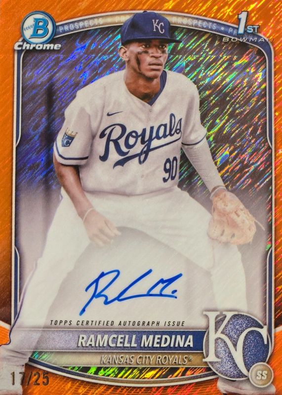 Best Prices Available For Sale of Ramcell Medina 2025 Bowman Chrome #CPA-RA Prospect Auto - Orange Shimmer Refractor /25 (1st)