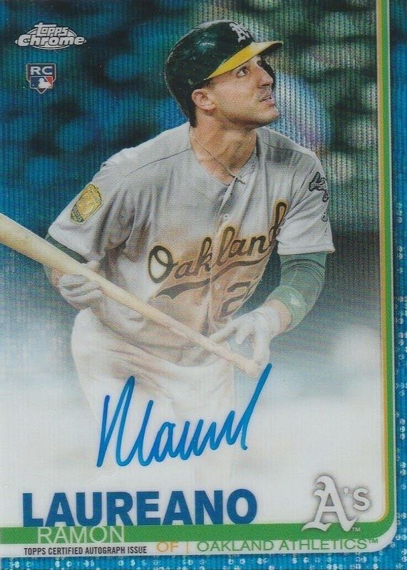 The Ramon Laureano 2019 Topps Chrome #RA-RL Rookie Auto - Blue Wave Refractor /150 card in Raw condition has not changed in price in the last 30 days and was last sold for $33.15 .