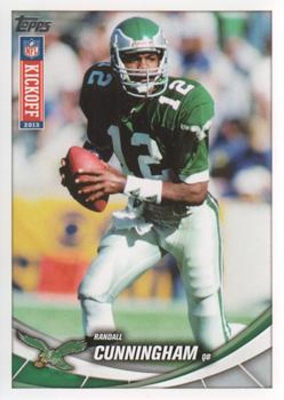 The Randall Cunningham 2013 Topps Kickoff #44 Base card is 1 of 2 Randall Cunningham's card variations in the 2013 Topps Kickoff set being tracked by Sports Card Investor, including Autographs /79.