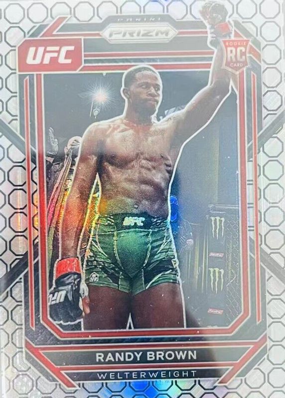 The Randy Brown 2023 Prizm UFC #106 Octagon /8 Rookie card in Raw condition has not changed in price in the last 30 days and was last sold for $48.00 .