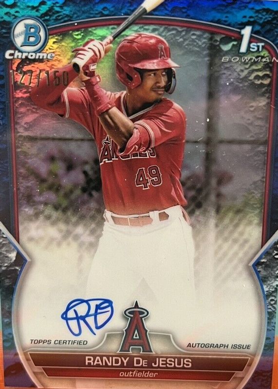 The Randy De Jesus 2023 Bowman #CPA-RD Chrome Prospect Auto - Blue Lunar Crater Refractor /150 (1st) card in Raw condition has not changed in price in the last 30 days and was last sold for $10.83 .