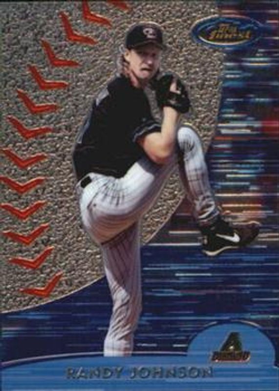 The Randy Johnson 2000 Topps Finest #51 Base card is 1 of 8 Randy Johnson's card variations in the 2000 Topps Finest set being tracked by Sports Card Investor, including #144 Base, #144 Gold Refractor /100, #51 Gold Refractor /100, #BB26 Ballpark Bounties, and #DC10 Dream Cast.