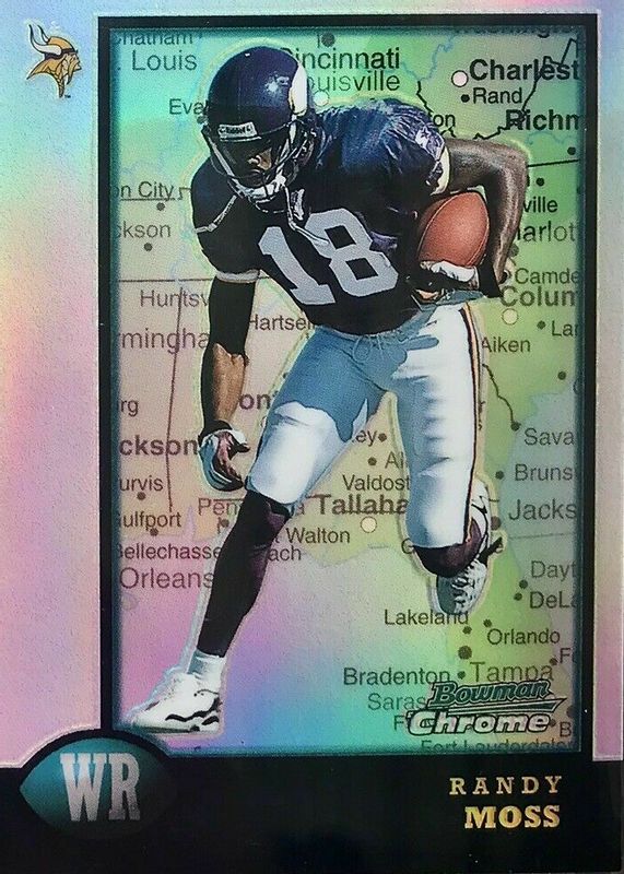 This card is 1 of 4 Randy Moss' card variations in the 1998 Bowman Chrome set being tracked by Sports Card Investor, including Base, Refractor, and Interstate.
