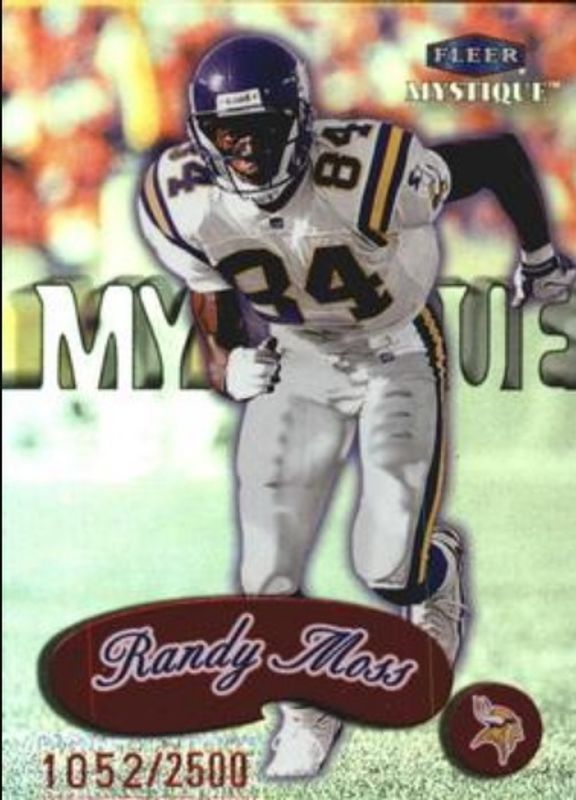 The Randy Moss 1999 Fleer Mystique #151 Base /2999 card is 1 of 8 Randy Moss' card variations in the 1999 Fleer Mystique set being tracked by Sports Card Investor, including #100 Base /2999, #100 Gold, #151M Masterpiece /1, #100M Masterpiece /1, and Feel the Game /545.