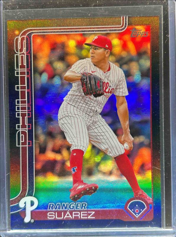 The Ranger Suarez 2025 Topps #56 Black Rainbow /10 card is 1 of 63 Ranger Suarez's card variations in the 2025 Topps set being tracked by Sports Card Investor, including Base, Aqua Holo Foil, Diamante Foil, Holo Foil, and Pink Diamante Foil.