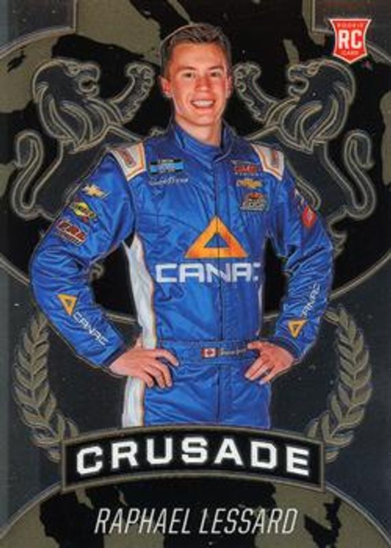 The Raphael Lessard 2021 Chronicles NASCAR #9 Crusade Rookie card is 1 of 56 Raphael Lessard's card variations in the 2021 Chronicles NASCAR set being tracked by Sports Card Investor, including Absolute, Absolute Autographs, Black, Black Autographs, and Black - Green.