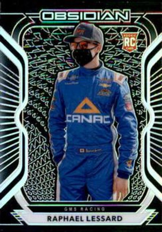 The Raphael Lessard 2021 Chronicles NASCAR #41 Obsidian Rookie card is 1 of 56 Raphael Lessard's card variations in the 2021 Chronicles NASCAR set being tracked by Sports Card Investor, including Absolute, Absolute Autographs, Black, Black Autographs, and Black - Green.