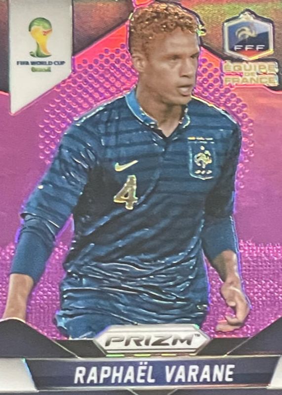 This card is 1 of 12 Raphael Varane's card variations in the 2014 Prizm World Cup set being tracked by Sports Card Investor, including Base, Blue & Red Wave, Red White Blue Power Plaid, Silver, and Yellow & Red Pulsar.