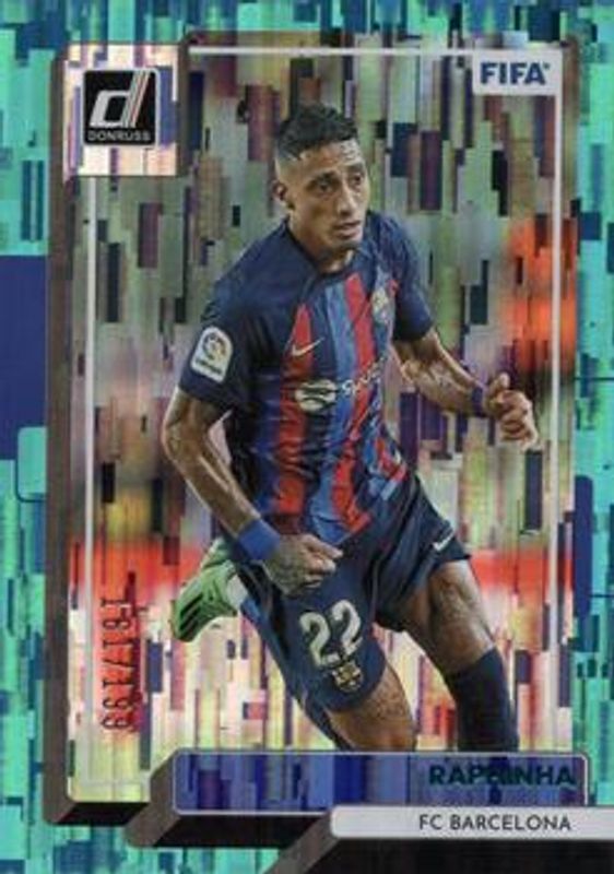 The Raphinha 2022 Donruss #34 Teal /199 card is 1 of 33 Raphinha's card variations in the 2022 Donruss set being tracked by Sports Card Investor, including Base, Green, Optic, Optic - Green Ice, and Optic - Holo.