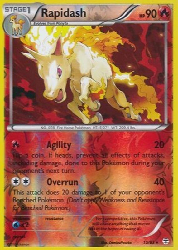 The Rapidash 2016 XY: Generations #15/83 Reverse Holo card in Raw TCG (Lightly Played) condition has moved down -$0.43 (-25.1%) in the last 30 days and was last sold for $1.28 .