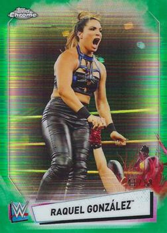 The Raquel Gonzalez 2021 Topps Chrome WWE #89 Green Refractor /99 card is 1 of 20 Raquel Gonzalez's card variations in the 2021 Topps Chrome WWE set being tracked by Sports Card Investor, including Base, Refractor, Aqua Refractor /150, Gold Refractor /50, and Orange Refractor /25.