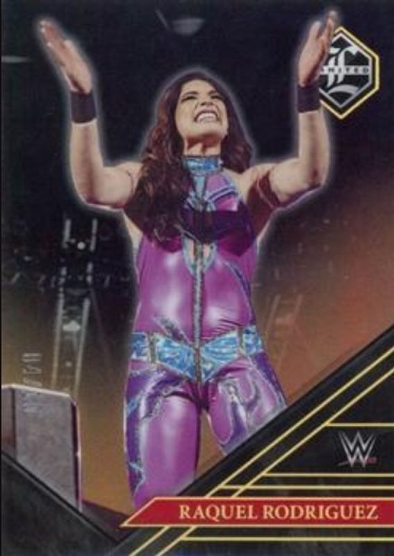 The Raquel Rodriguez 2023 Chronicles WWE #249 Gold /10 card is 1 of 54 Raquel Rodriguez's card variations in the 2023 Chronicles WWE set being tracked by Sports Card Investor, including #11 Base, #351 Base, #142 Base, #249 Base, and #11 Bronze.