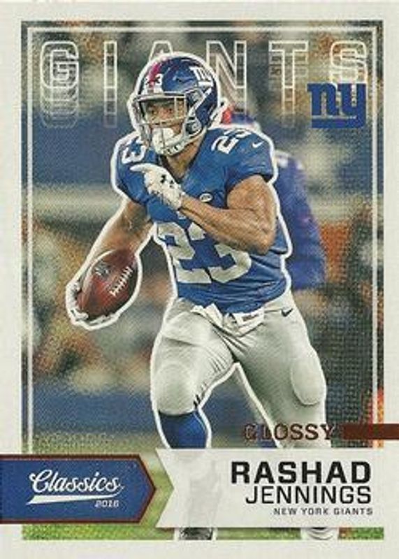 The Rashad Jennings 2016 Classics #68 Glossy card is 1 of 14 Rashad Jennings' card variations in the 2016 Classics set being tracked by Sports Card Investor, including Base, Blank Back, Blue Back, No Name, and Red Back.