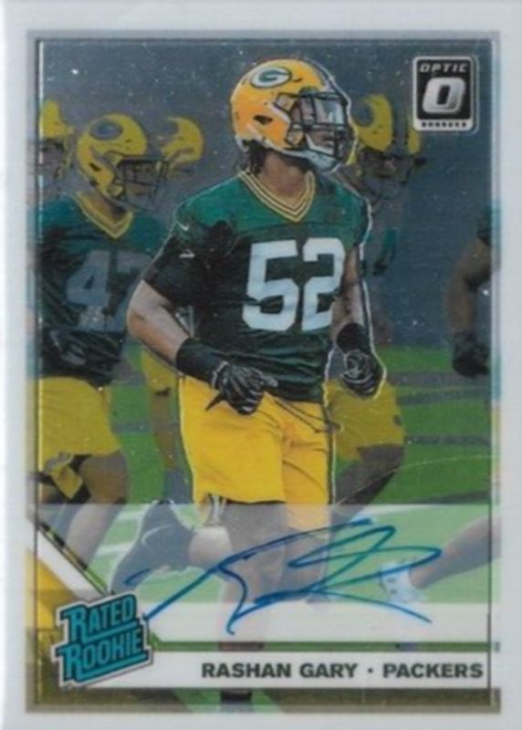 This card is 1 of 11 Rashan Gary's card variations in the 2019 Optic set being tracked by Sports Card Investor, including Rated Rookie Autographs - Black Pandora (/25), Rated Rookie Autographs - Blue (/75), Rated Rookie Autographs - Bronze, Rated Rookie Autographs - Gold (/10), and Rated Rookie Autographs - Green (/5).