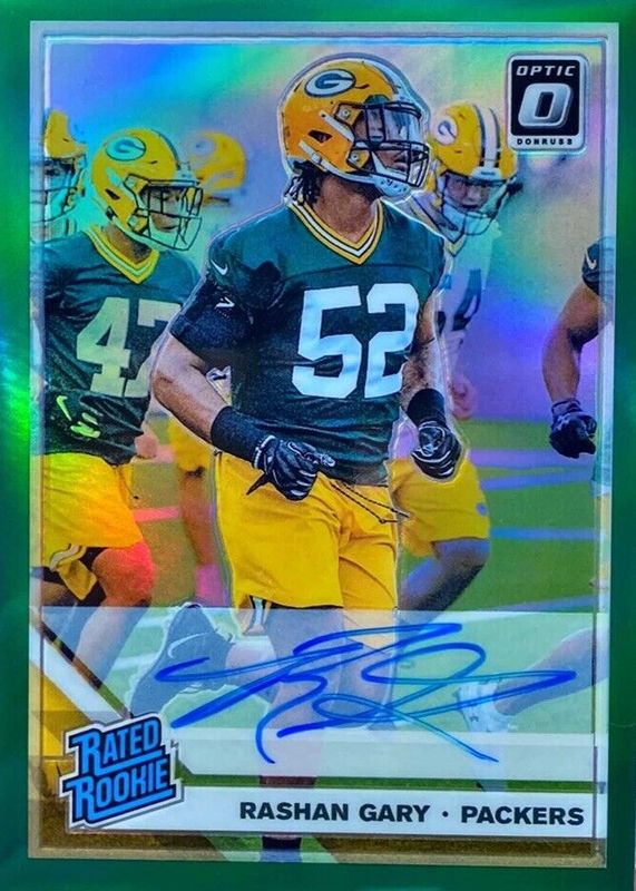 The Rashan Gary 2019 Optic #195 Rated Rookie Autographs - Green (/5) card in Raw condition has not changed in price in the last 30 days and was last sold for $83.91 .