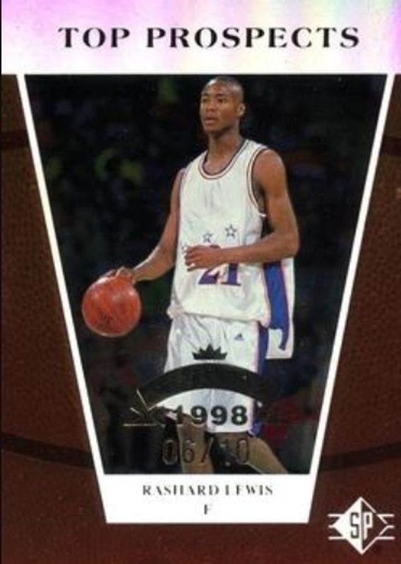 The Rashard Lewis 1998 SP Top Prospects #45 President's Edition /10 Rookie card is 1 of 6 Rashard Lewis' card variations in the 1998 SP Top Prospects set being tracked by Sports Card Investor, including #45 Base, #6 Base, #6 President's Edition /10, #5 Destination Stardom, and #RL Vital Signs /23.