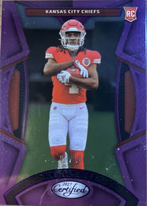 The Rashee Rice 2023 Certified #108 Mirror Purple /10 Rookie card in Raw condition has not changed in price in the last 30 days and was last sold for $21.50 .