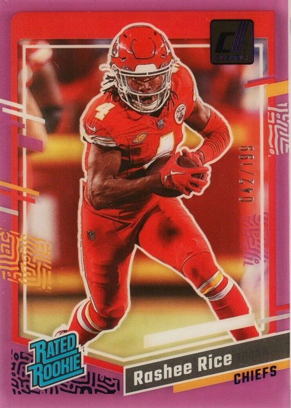 The Rashee Rice 2023 Clearly Donruss #79 Purple /199 Rookie card in Raw condition has not changed in price in the last 30 days and was last sold for $3.00 .