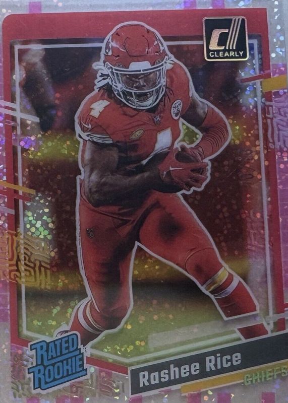 This card is 1 of 15 Rashee Rice's card variations in the 2023 Clearly Donruss set being tracked by Sports Card Investor, including Base, Gold, Holo Mosaic, Holo Rated Rookie Logo, and Purple /199.