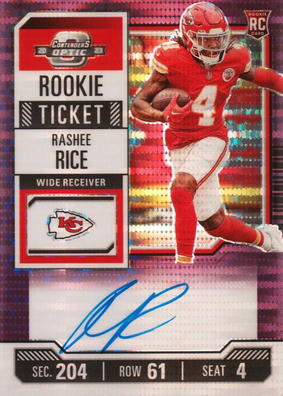 Best Prices Available For Sale of Rashee Rice 2023 Contenders Optic #129 Rookie Ticket Auto - Purple Pulsar /21
