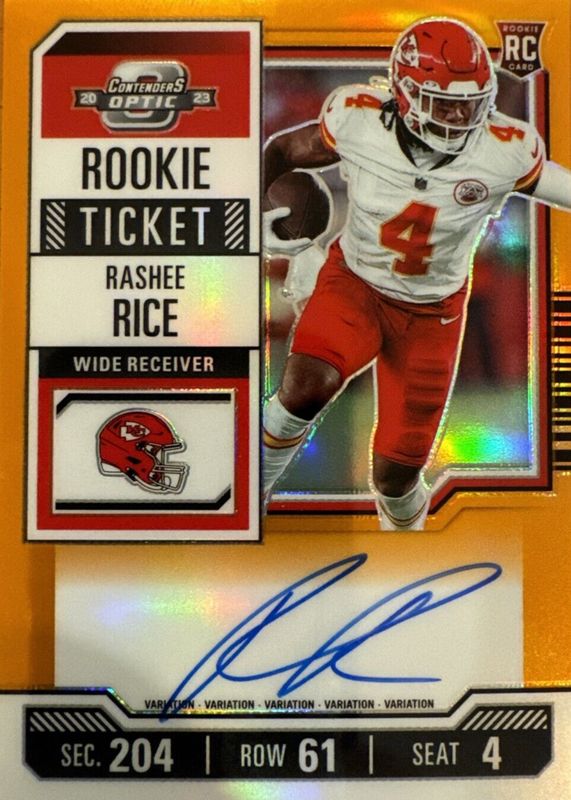 The Rashee Rice 2023 Contenders Optic #129 Rookie Ticket Auto Variation - Orange /35 card in Raw condition has not changed in price in the last 30 days and was last sold for $99.99 .