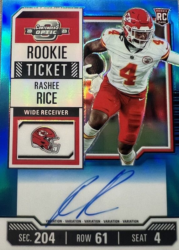 This card is 1 of 49 Rashee Rice's card variations in the 2023 Contenders Optic set being tracked by Sports Card Investor, including Rookie of the Year Contenders Autographs - Blue (/45), Rookie Ticket Auto, Rookie Ticket Auto - Red (/125), Rookie Ticket Auto - Silver, and Rookie Ticket Auto Variation.