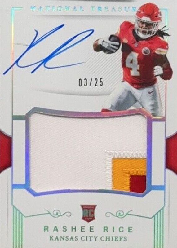 This card is 1 of 51 Rashee Rice's card variations in the 2023 National Treasures set being tracked by Sports Card Investor, including Rookie Material Signatures - Green Jersey Number (/4), Rookie Patch Auto - Green Jersey Number (/4), Crossover Rookie Patch Autographs /99, Rookie Material Signatures /99, and Rookie Patch Auto /99.