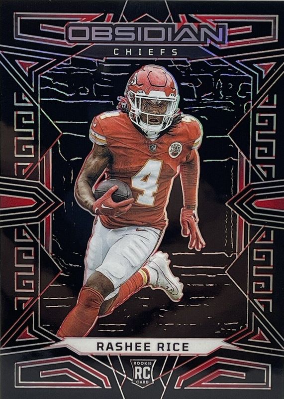 The Rashee Rice 2023 Obsidian #151 Electric Etch Red /8 Rookie card in Raw condition has not changed in price in the last 30 days and was last sold for $100.00 .