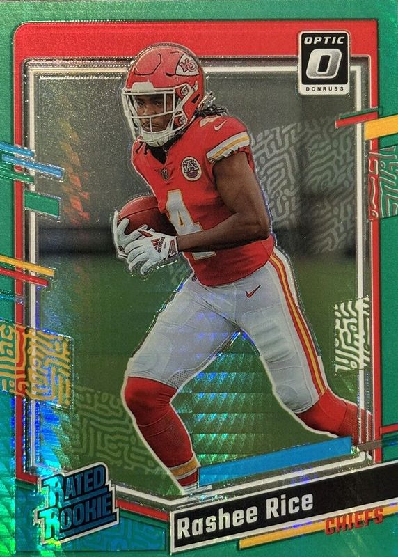 The Rashee Rice 2023 Optic #257 Green Hyper Rookie card in Raw condition has not changed in price in the last 30 days and was last sold for $3.00 .