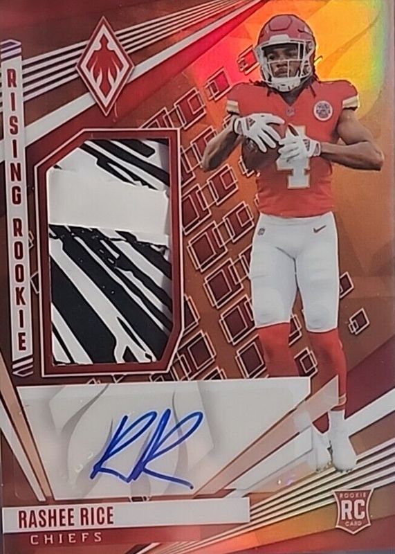 The Rashee Rice 2023 Phoenix #RMS-RRI Rising Rookie Material Signatures - Gloves (/99) card in Raw condition has not changed in price in the last 30 days and was last sold for $56.51 .