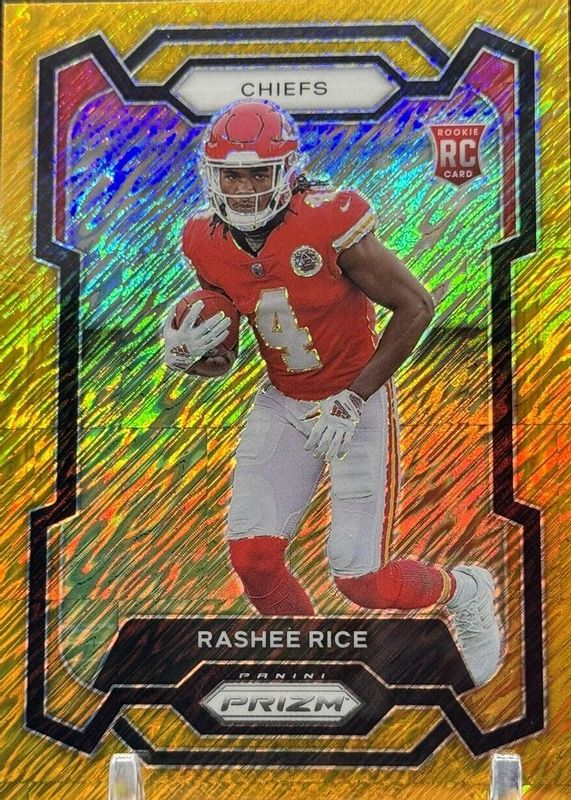 The Rashee Rice 2023 Prizm #350 Gold Shimmer /10 Rookie card in Raw condition has not changed in price in the last 30 days and was last sold for $505.00 .