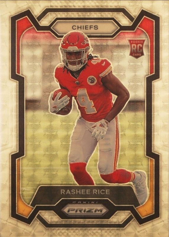 The Rashee Rice 2023 Prizm #350 Gold Vinyl /5 Rookie card in Raw condition has not changed in price in the last 30 days and was last sold for $1,100.00 .