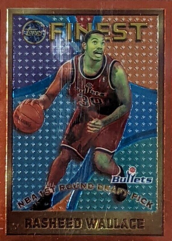 This card is 1 of 6 Rasheed Wallace's card variations in the 1995 Topps Finest set being tracked by Sports Card Investor, including Base, Base (with Coating), Rack Pack, Rack Pack - Refractor, and Veteran/Rookie.