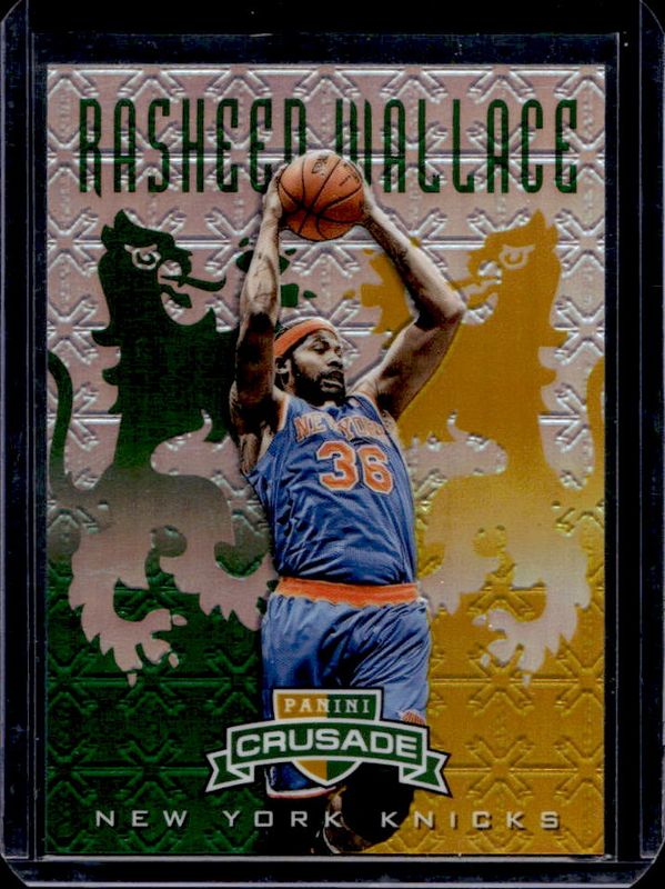 The Rasheed Wallace 2012 Crusade #162 Prizm Green & Gold /25 card is 1 of 17 Rasheed Wallace's card variations in the 2012 Crusade set being tracked by Sports Card Investor, including Base, Prizm Blue & Gold, Prizm Red & Gold /99, Prizm Purple & Gold /49, and Prizm Gold /10.