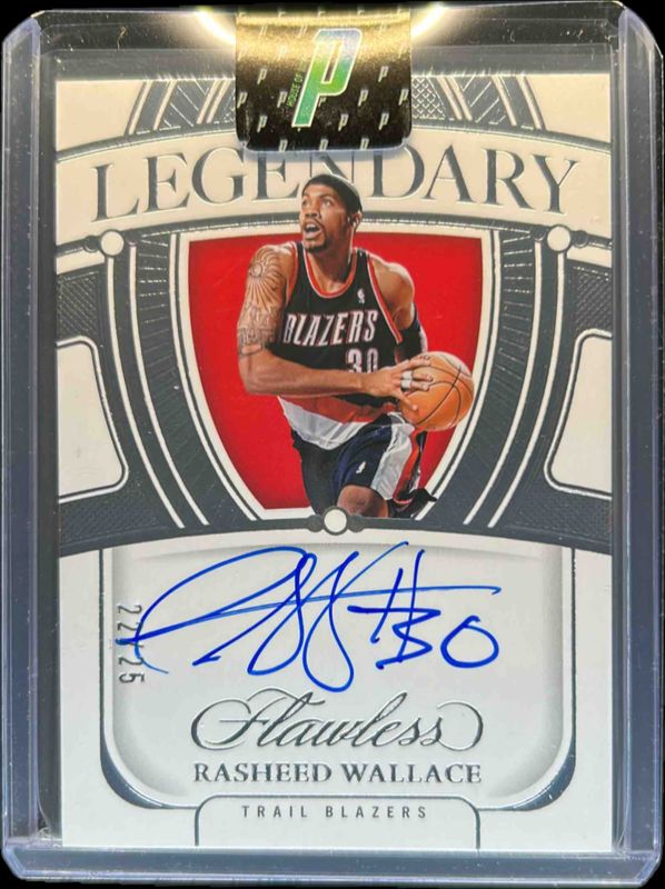 The Rasheed Wallace 2023 Flawless #LS-RWL Legendary Scripts /25 card is 1 of 21 Rasheed Wallace's card variations in the 2023 Flawless set being tracked by Sports Card Investor, including Flawless Autographs /25, Flawless Shade Signatures /25, Flawless Autographs - Ruby /15, Flawless Shade Signatures - Ruby /15, and Legendary Scripts - Ruby /15.