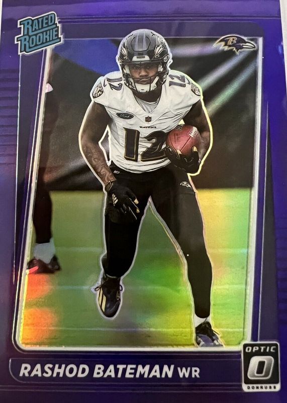 The Rashod Bateman 2021 Optic #210 Purple /50 Rookie card in Raw condition has not changed in price in the last 30 days and was last sold for $10.00 .