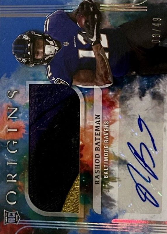 This card is 1 of 12 Rashod Bateman's card variations in the 2021 Origins set being tracked by Sports Card Investor, including Origins Autographs - Gold Ink (/25), Origins Autographs - Silver Ink (/49), Rookie Jumbo Jersey Autographs, Rookie Jumbo Jersey Autographs - Red /99, and Rookie Jumbo Jersey Autographs - Orange /75.
