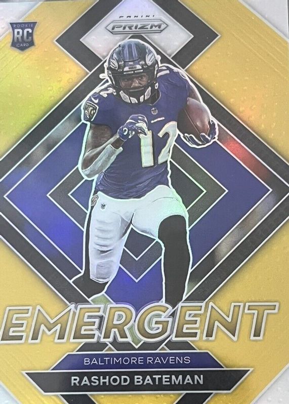 The Rashod Bateman 2021 Prizm #E-10 Emergent - Gold /10 Rookie card in Raw condition has not changed in price in the last 30 days and was last sold for $150.00 .
