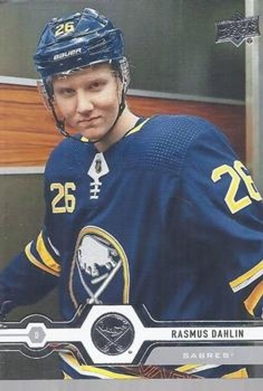 The Rasmus Dahlin 2019 Upper Deck #19 Base card is 1 of 22 Rasmus Dahlin's card variations in the 2019 Upper Deck set being tracked by Sports Card Investor, including Clear Cut, UD Exclusives Clear Cut, UD Exclusives /100, UD High Gloss /10, and Fanimation.